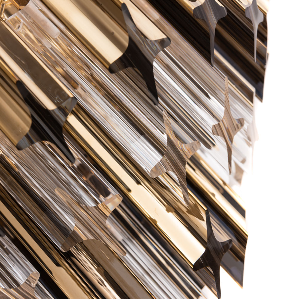 Свободно свисающие хрустальные декоративные элементы, расположенные в несколько рядов, образуют объемную конструкцию, которая при движении воздуха в помещении начинает «звучать». Сочетание золотых и прозрачных декоративных подвесок создают яркий, ослепительный образ модели. В коллекции четыре люстры разных размеров, есть возможность подобрать в помещения разных форматов. Большое бра может быть дополнением в ансамбль с люстрой, а может быть самостоятельным украшением интерьера.