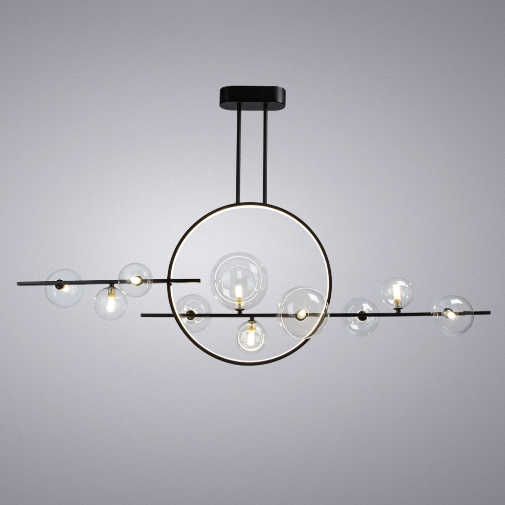 Светильник Arte Lamp A7790SP-75BK серии SATURN. Подчеркнет стиль помещения. Размеры 1.5x0.3x0.9 m. Параметры пылевлагозащиты IP — 20. Плафон акриловый прозрачный, а материал/цвет арматуры алюминий/черный. Имеются встроенные светодиодные лампы, рассчитанные на весь срок службы светильника. Площадь освещения охватывает 13 m². Идеально подходит для кухни или спальни. Страна происхождения бренда — ИТАЛИЯ. Вес с упаковкой 6.4 kg