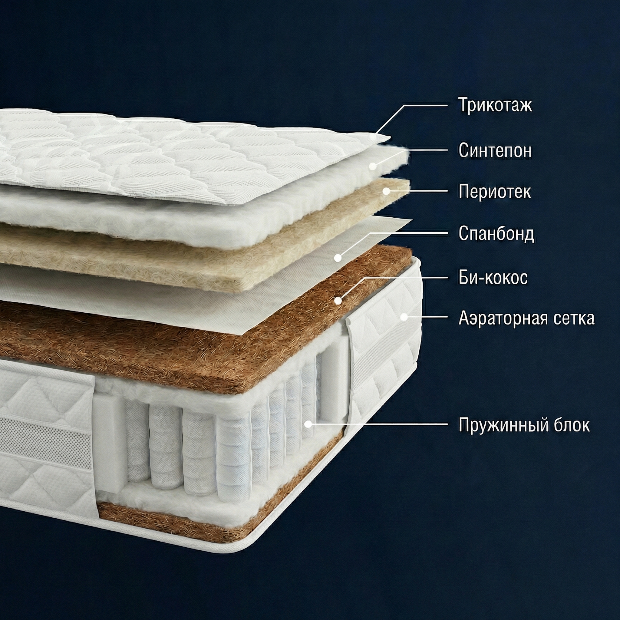Для того, чтобы воздухообмен в матрасе происходил беспрепятственно, боковая поверхность чехла матраса выполнена из сетки 3Д аэрации, которая обеспечивает полноценную циркуляцию воздуха в матрасе.