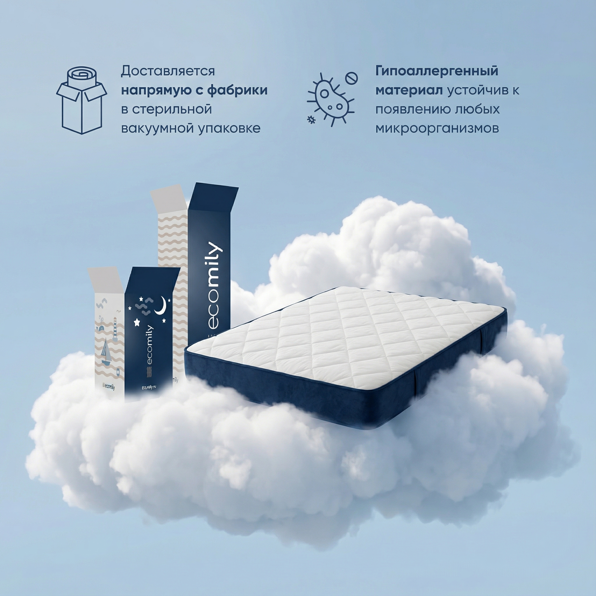 Премиальная линейка EcoMily: 5 пен различной плотности для адаптивности и комфорта. Верхний слой Memory-пена повторяет контуры тела и(memory) обеспечивает расслабление и минимальное давление. HR-пена даёт пружинящий, но мягкий комфорт и хорошую поддержку за счёт ячеек разного размера. Нижние слои — угольная пена повышенной жесткости, устойчивая к деформации и обладающая антибактериальными свойствами. Общий эффект: расслабление, правильная поддержка и антиаллергенность.